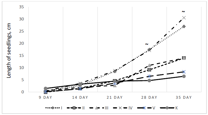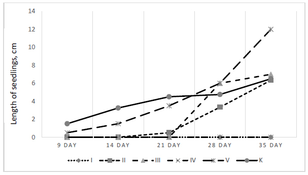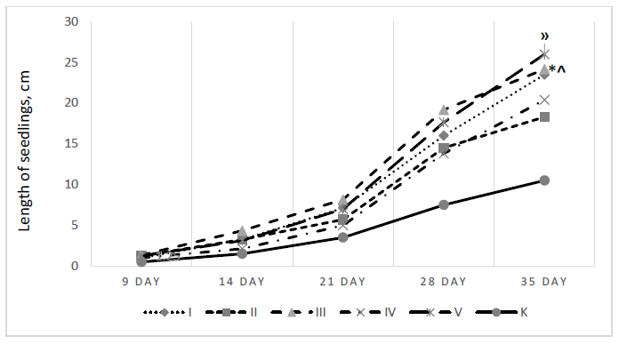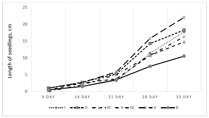 The length of the seedlings was measured every 7 days from the moment of emergence of the first seedlings for 35 days after sowing the seeds.